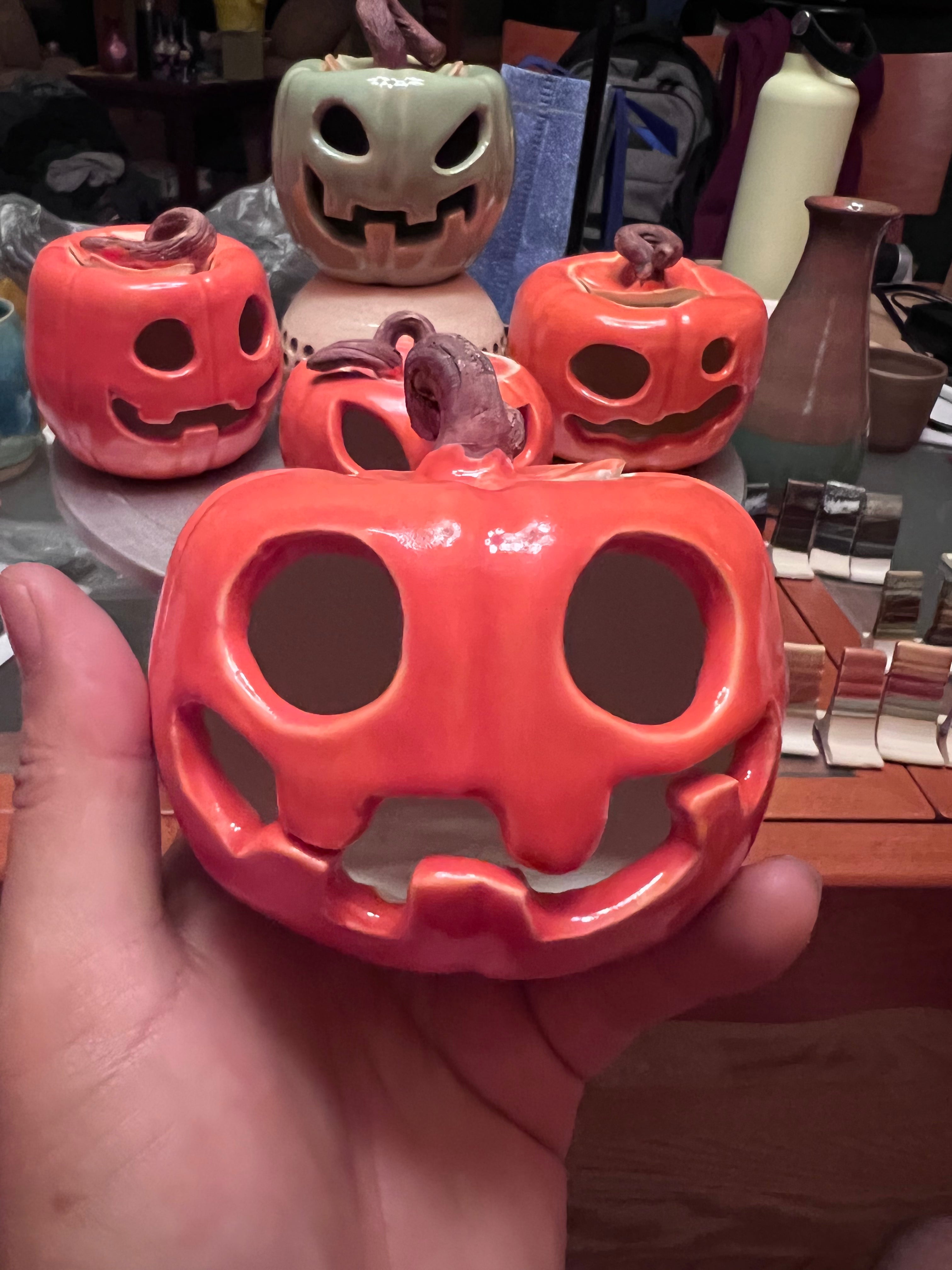 Jack-o-lanternsJack-o-lanterns were the first items I ventured to make that were not a straightforward cylinder. They were enclosed forms that I then altered to add ridges, cut to make their faces, and attached extra clay for their curly stems. They look wicked with a tea light inside!