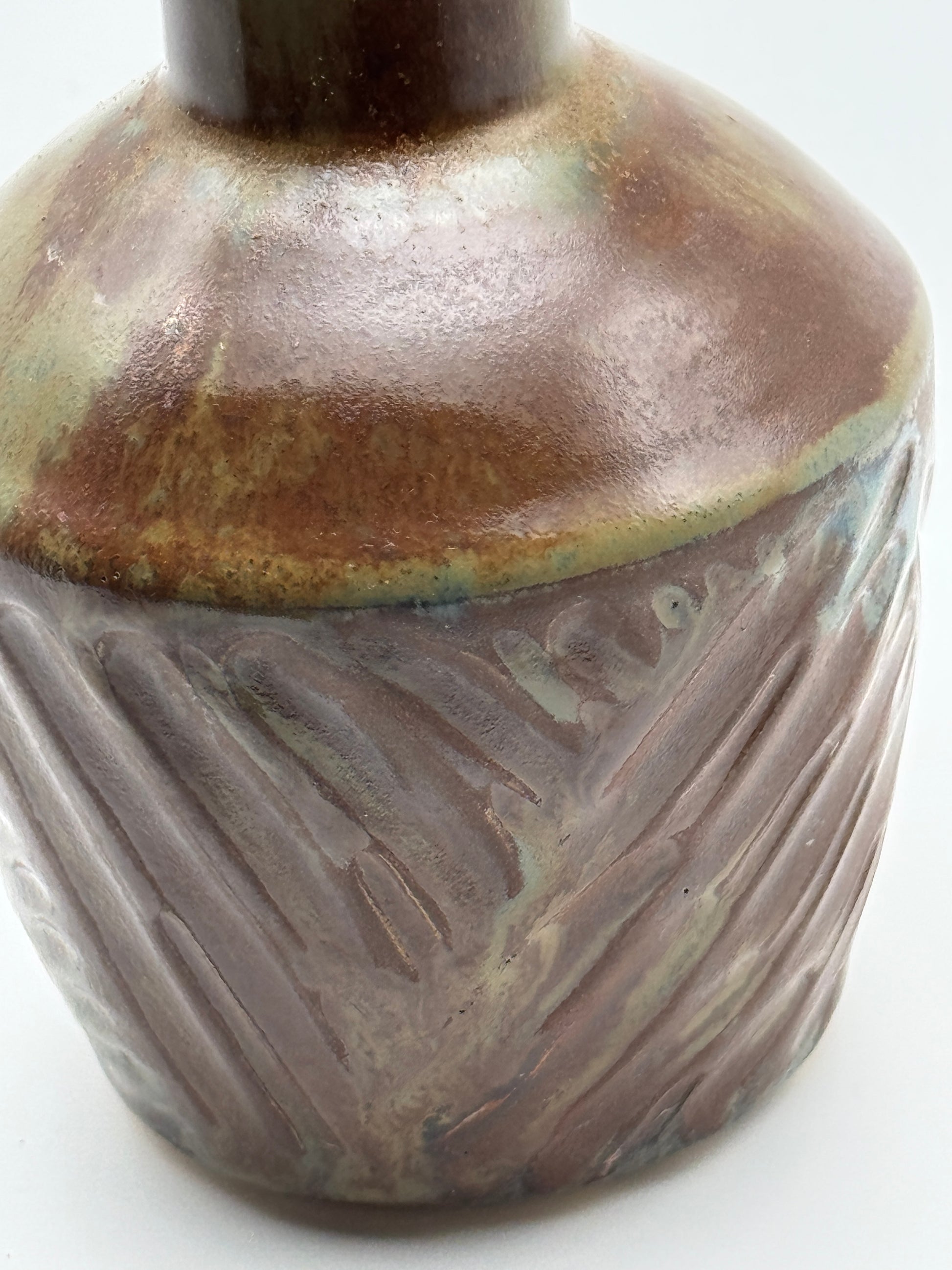 This soap dispenser was thrown from 1.5 pounds of white stoneware clay. The glaze I used breaks and pools over the carvings texture to create additional visual interest.