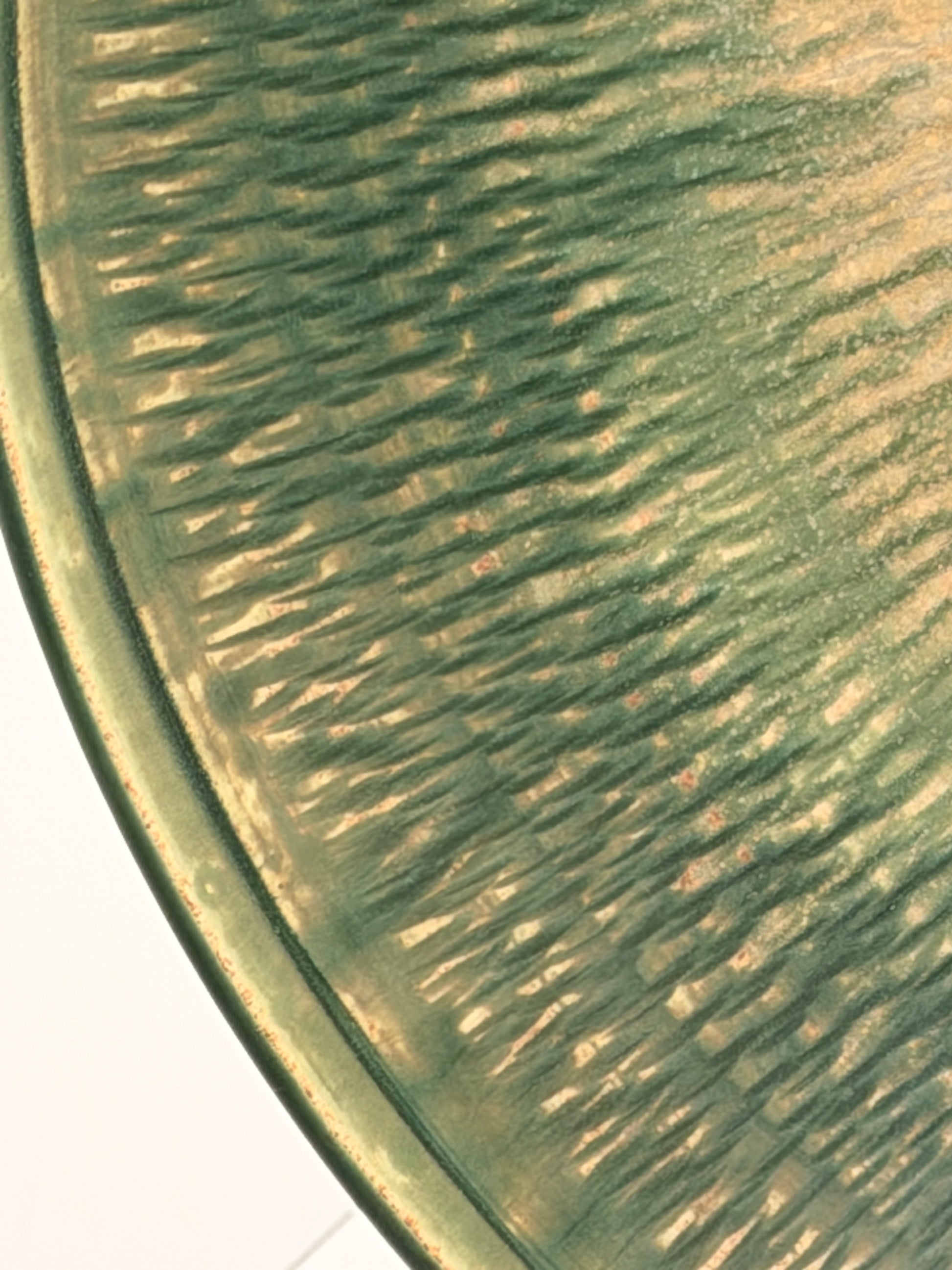 - Finish: Satin seafoam band with gentle drips over a creamy, speckled base; textured interior with glaze variation