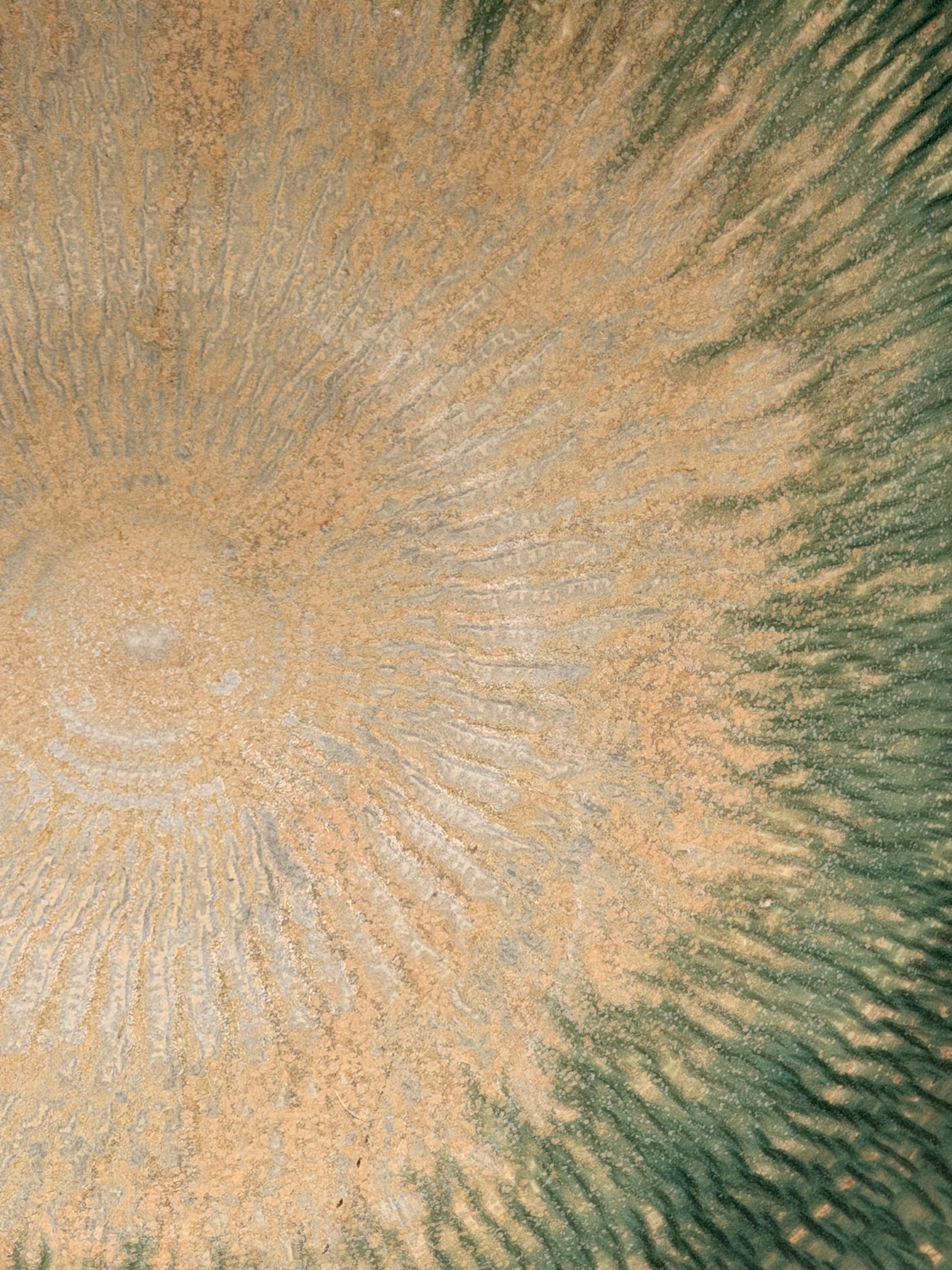 A generous, one-of-a-kind stoneware bowl with a soft seafoam-green rim and a warm, creamy body. The interior is textured with radiating lines that catch the glaze in a starburst pattern—subtle, calm, and quietly dramatic from every angle.